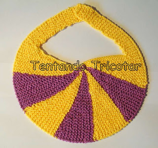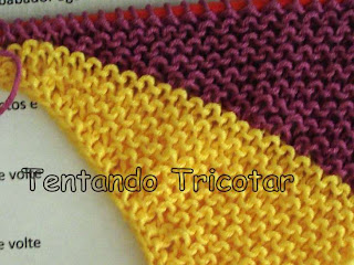 Colocar 3 pontos e aumentar sempre pelo avesso 1 ponto de cada lado até obter 51 pontos na agulha. Trabalhando em ponto tricot por 9 cordões depois passar para ponto Meia no direito e Tricot no avesso.