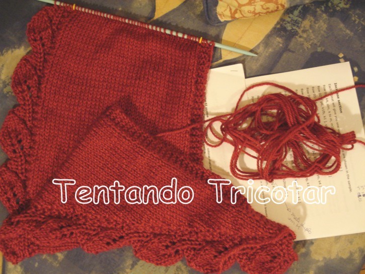 Tricotar em ponto Meia pelo direito e Tricot pelo avesso fazendo 1 aumento de cada lado, a 1 malha da borda, a cada 2 carreiras, até obter 23 pontos.